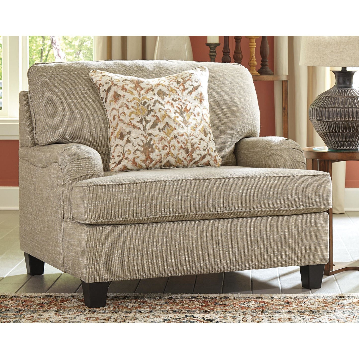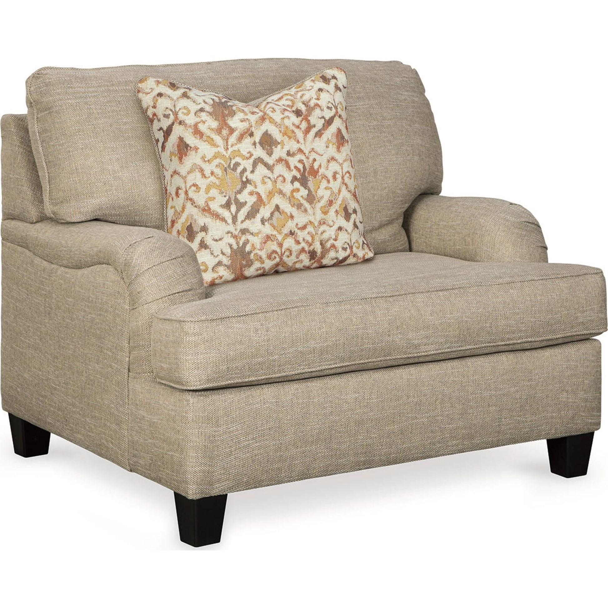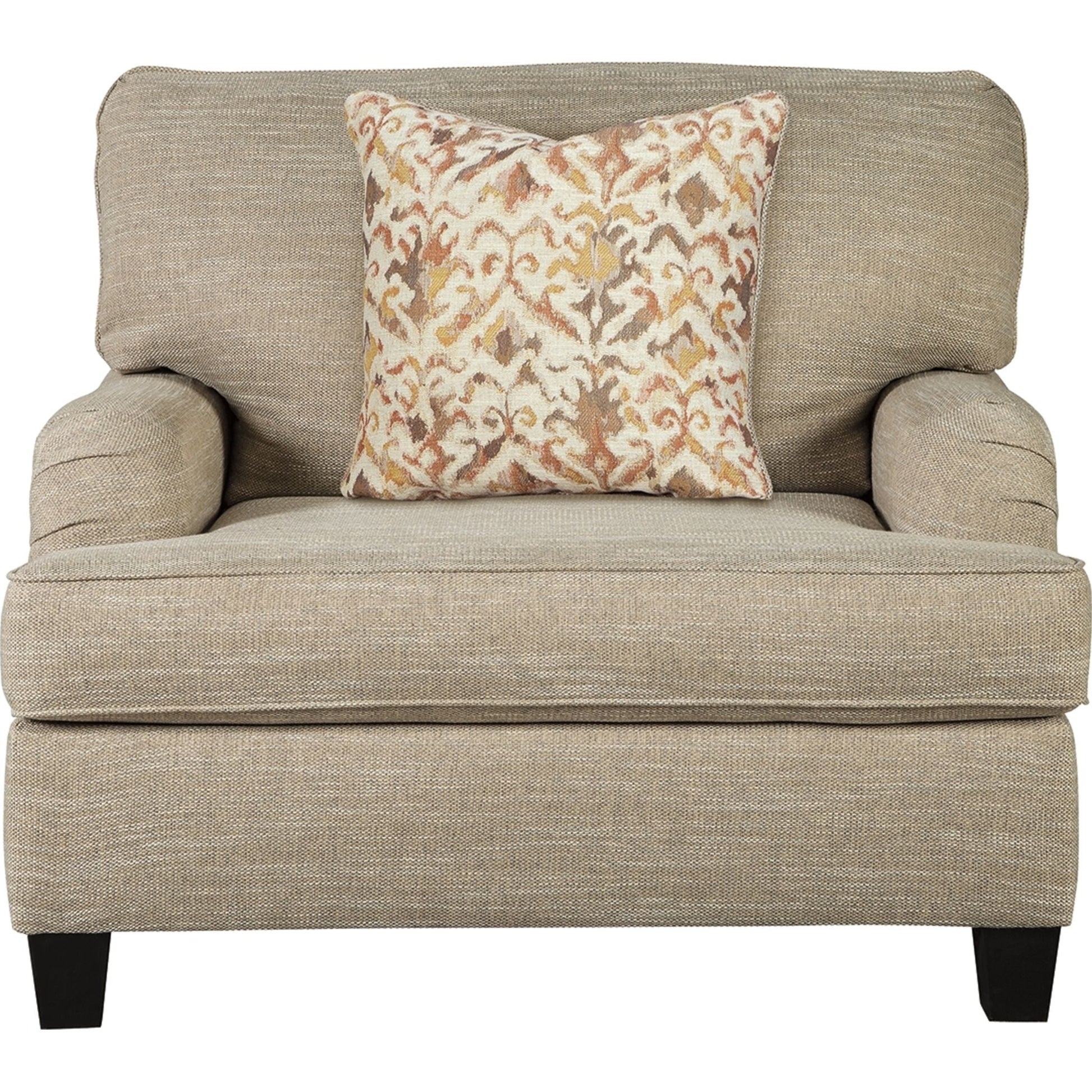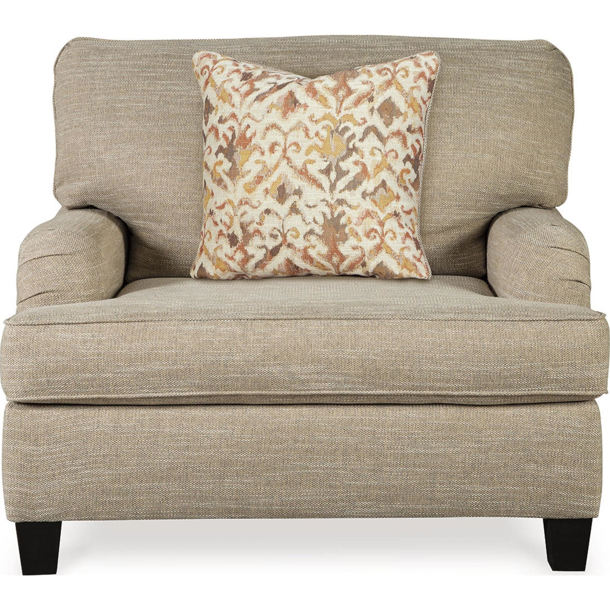 With its elegant Charles of London arms, soothing shades and sumptuous comfort, this oversized chair brings a classic look beautifully into the present. Loaded with multi-tonal interest, the chair's wheat-hue upholstery is a fresh choice in neutrals. Marvelously muted ikat pillow enhances the warm, cozy feel, while clean-lined tapered feet in a dark finish infuse modern appeal.