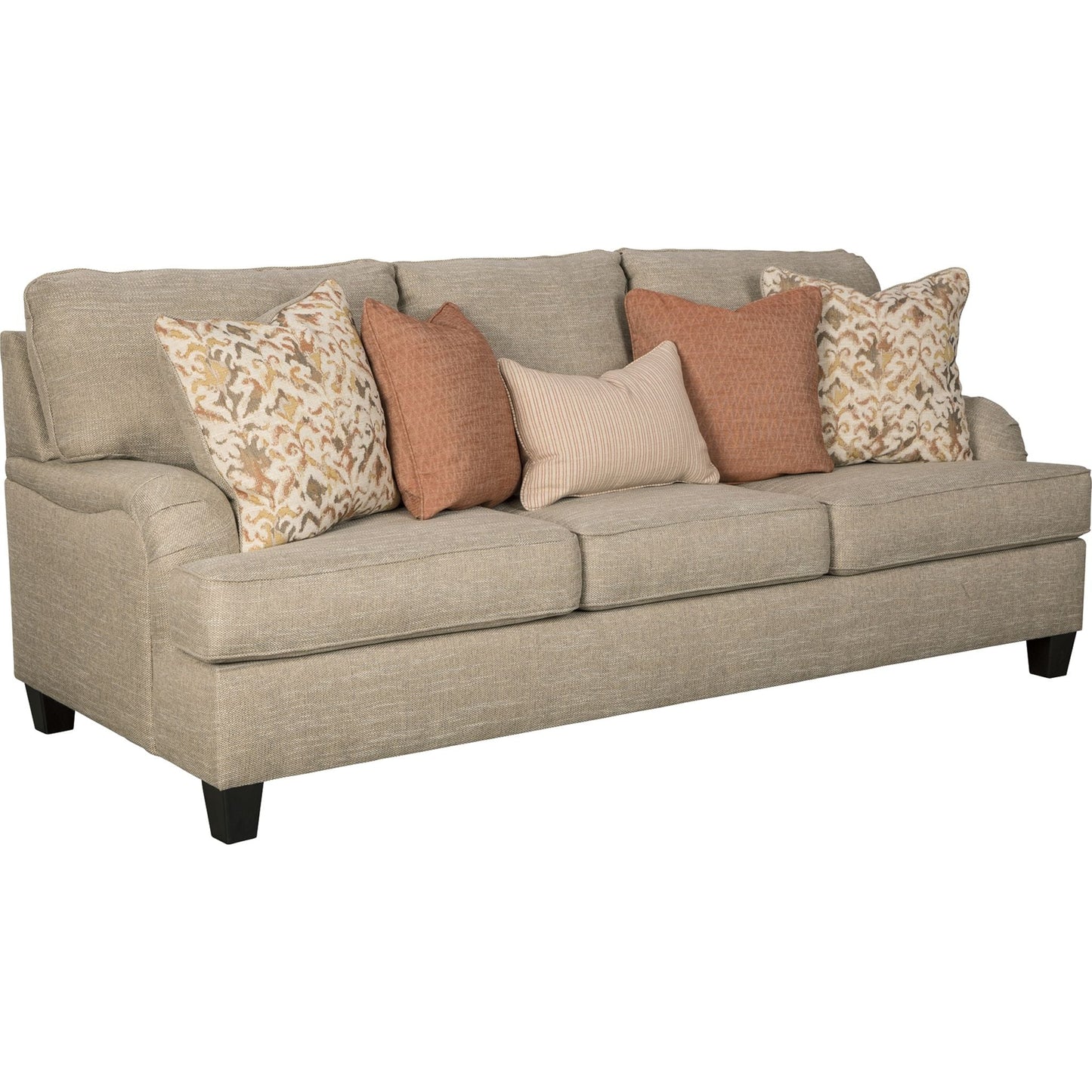 With its elegant Charles of London arms, soothing shades and sumptuous comfort, this sofa brings a classic look beautifully into the present. Loaded with multi-tonal interest, the sofa’s wheat-hue upholstery is a fresh choice in neutrals. Marvelously muted accent pillow collection includes ikat patterning, diamond texturing and a fresh laundry stripe for a warm, cozy feel, while clean-lined tapered feet in a dark finish infuse a sense of modern appeal.