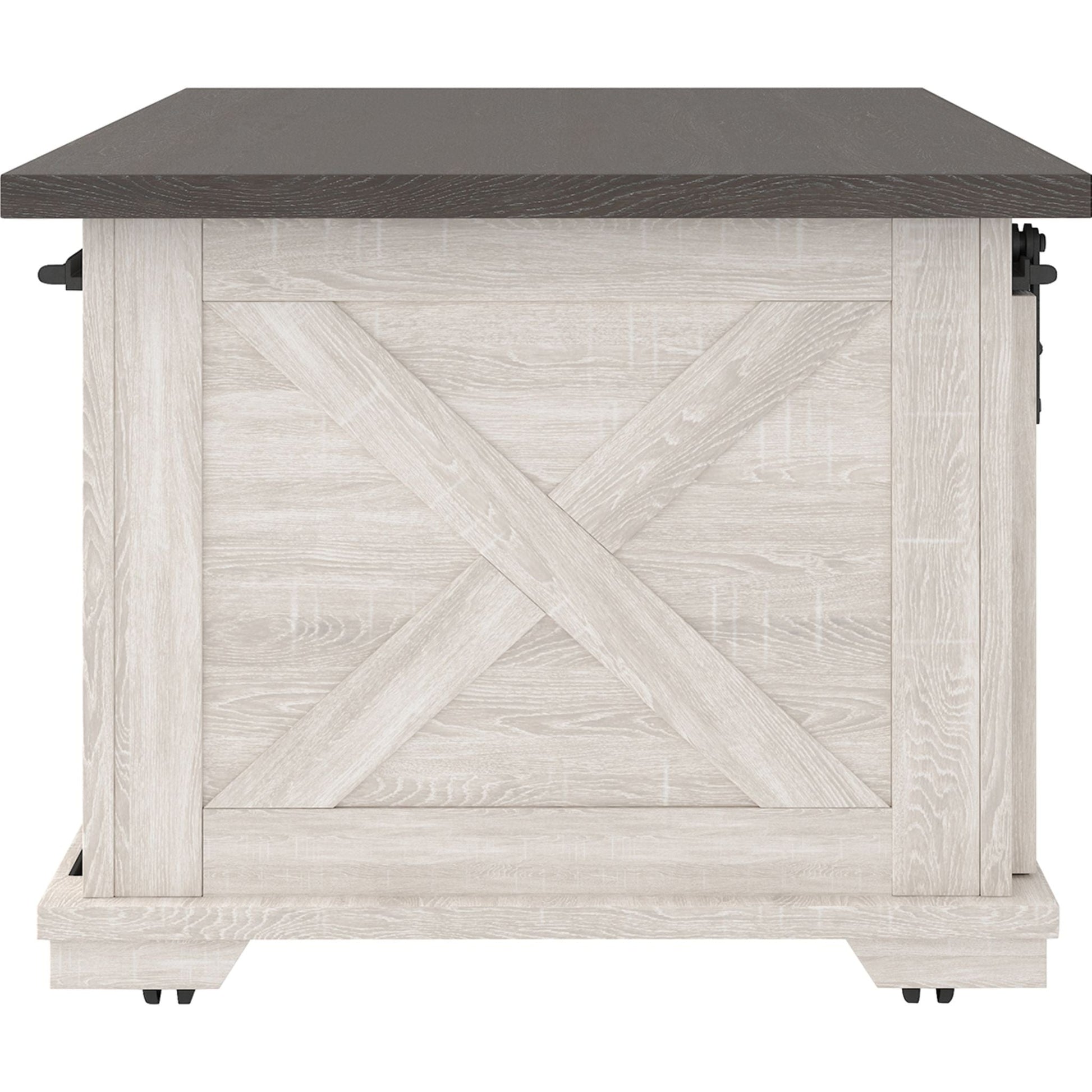 Raise the bar on modern farmhouse design with this versatile coffee table. Sporting a two-tone, gray and antiqued white color scheme and cross buck design, the table's unique sliding 'barn door' moves to reveal shelved storage space. Easy roll casters add a cool touch that's right on trend.