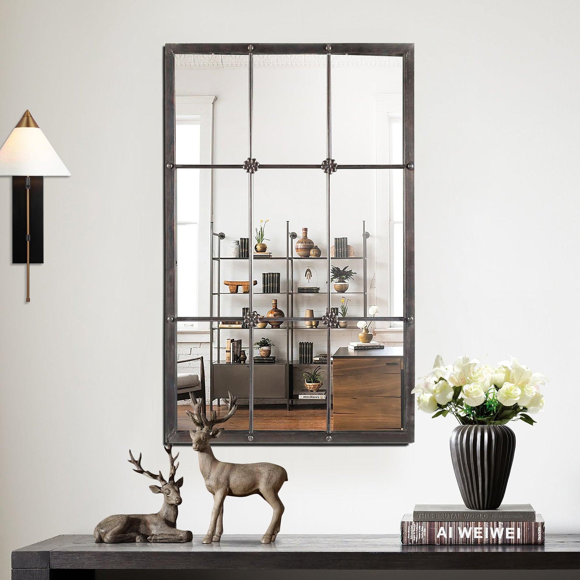 Tired of boring walls? This classic windowpane wall mirror will instantly bring light in your home and create the illusion of space. This rectangular window wall mirror features a single piece mirror behind nine windowpane sections and arrives ready to hang with the hardware included. The wall mirror is ready to mount to any flat surface with the metal tabs attached to the back of the frame. The mirror can be hung horizontally or vertically as you please. The frame is metal with one piece mirror divided into sections to look like a window. Brighten your home with this beautiful windowpane wall mirror. The mirror has a metal frame in a rustic brown finish. The panes are adorned with a metal flower in the center. The wall mirror will make a wonderful focal point for your entryway, living space, hallway, or bedroom.