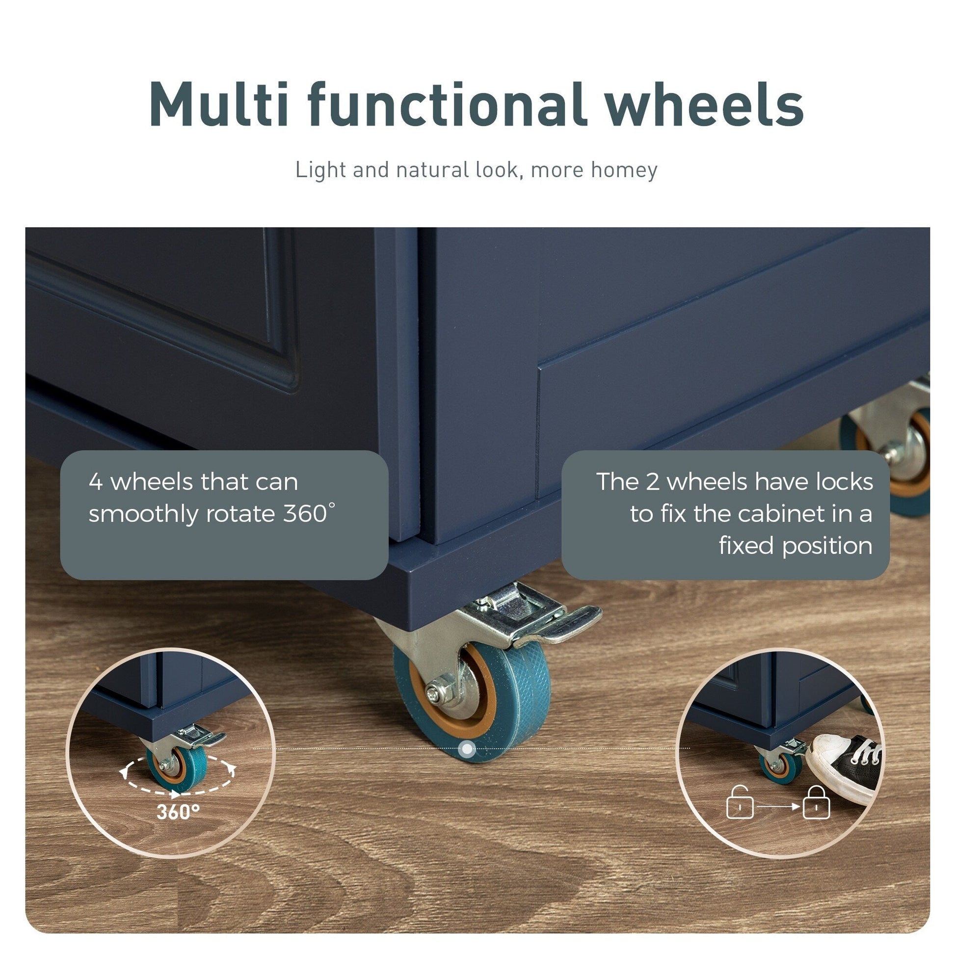 Add style and functionality to your kitchen with the MAISON ARTS Rolling Kitchen Island Cart on Wheels. With a versatile design that suits both traditional and cottage interiors, this cart features ample storage including a large cabinet, three drawers, a bottle rack, and a towel rack. The drop-leaf countertop is perfect for compact spaces, and the four wheels with brakes make movement and placement easy. Made of MDF and rubber wood with a premium painted finish, this cart is available in white, black, grey, or dark blue.