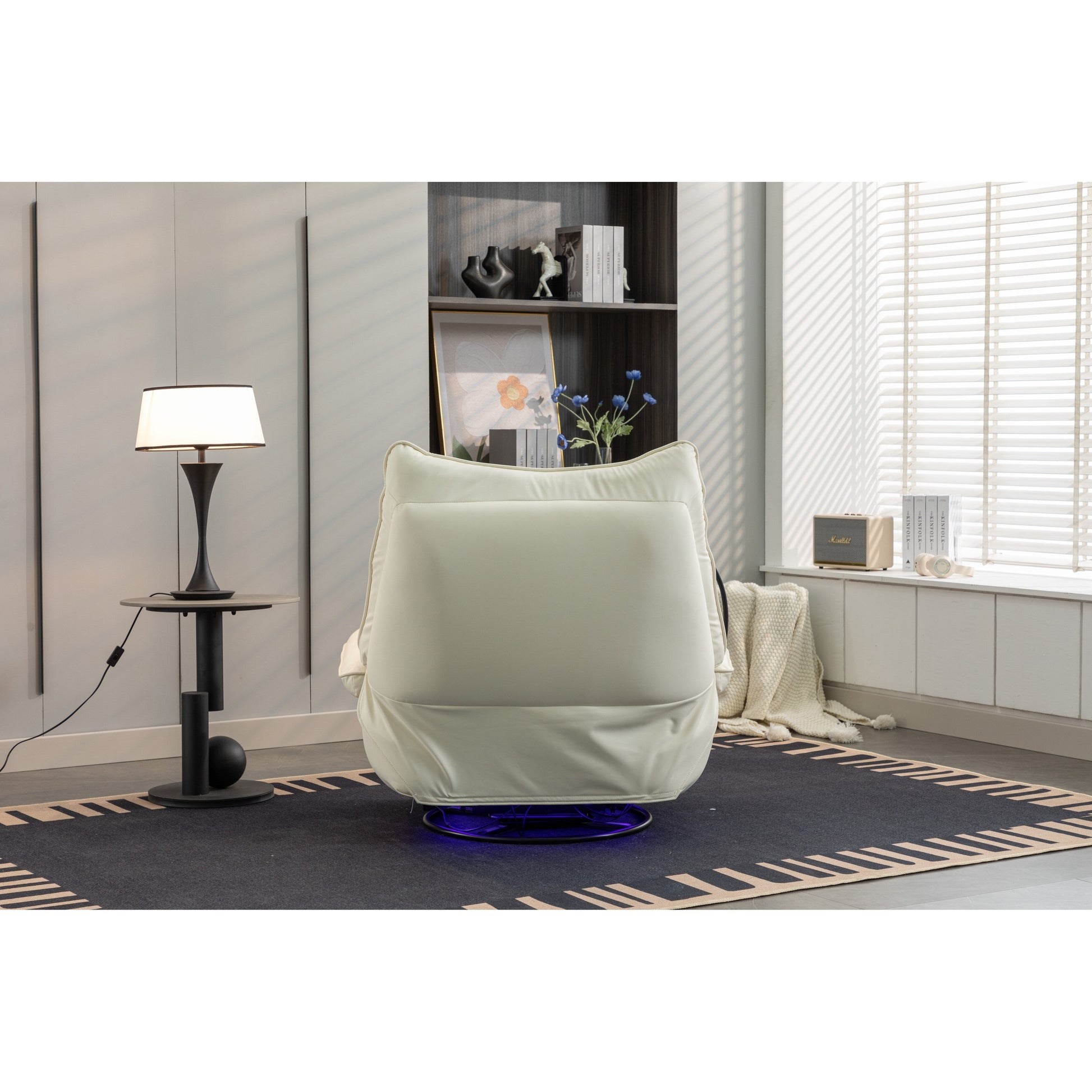 - This 270° swivel glider recliner combines convenience and entertainment with a built-in phone holder and charging ports. Equipped with Bluetooth speakers for immersive sound, you can easily enjoy videos or music while relaxing. The chair also offers hidden arm storage for small items, and its easy assembly takes only 3 minutes, making it a great addition to any living room, bedroom, or apartment.