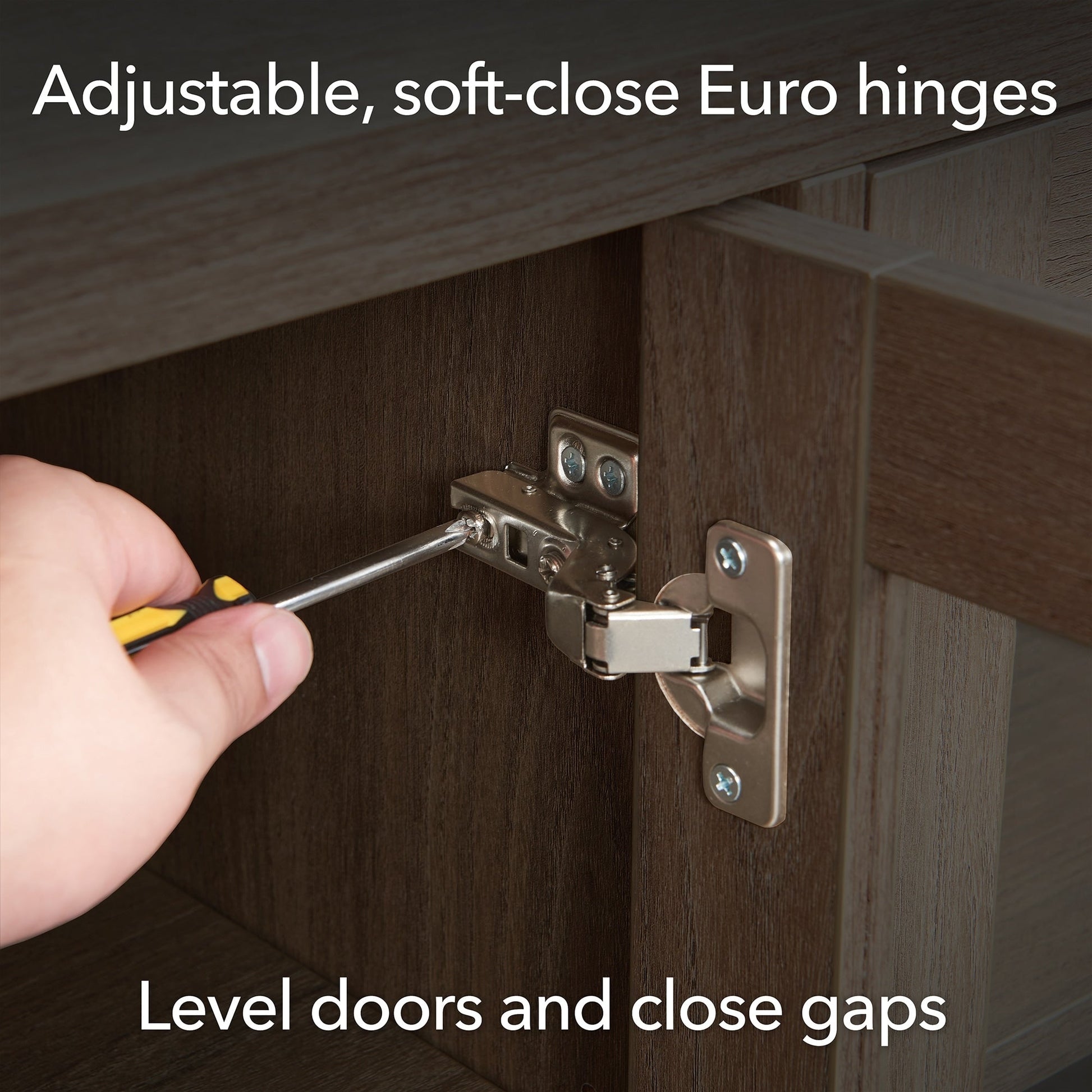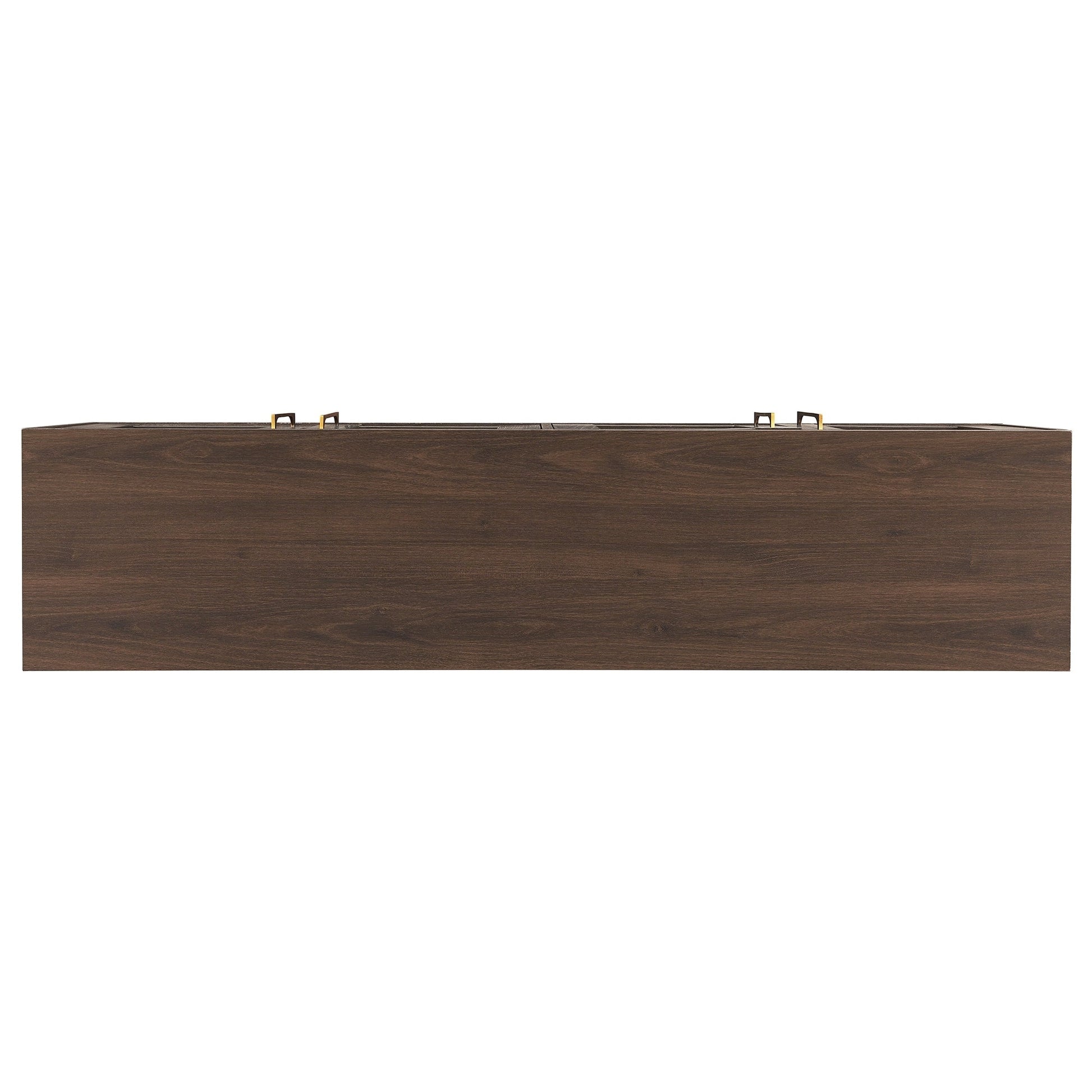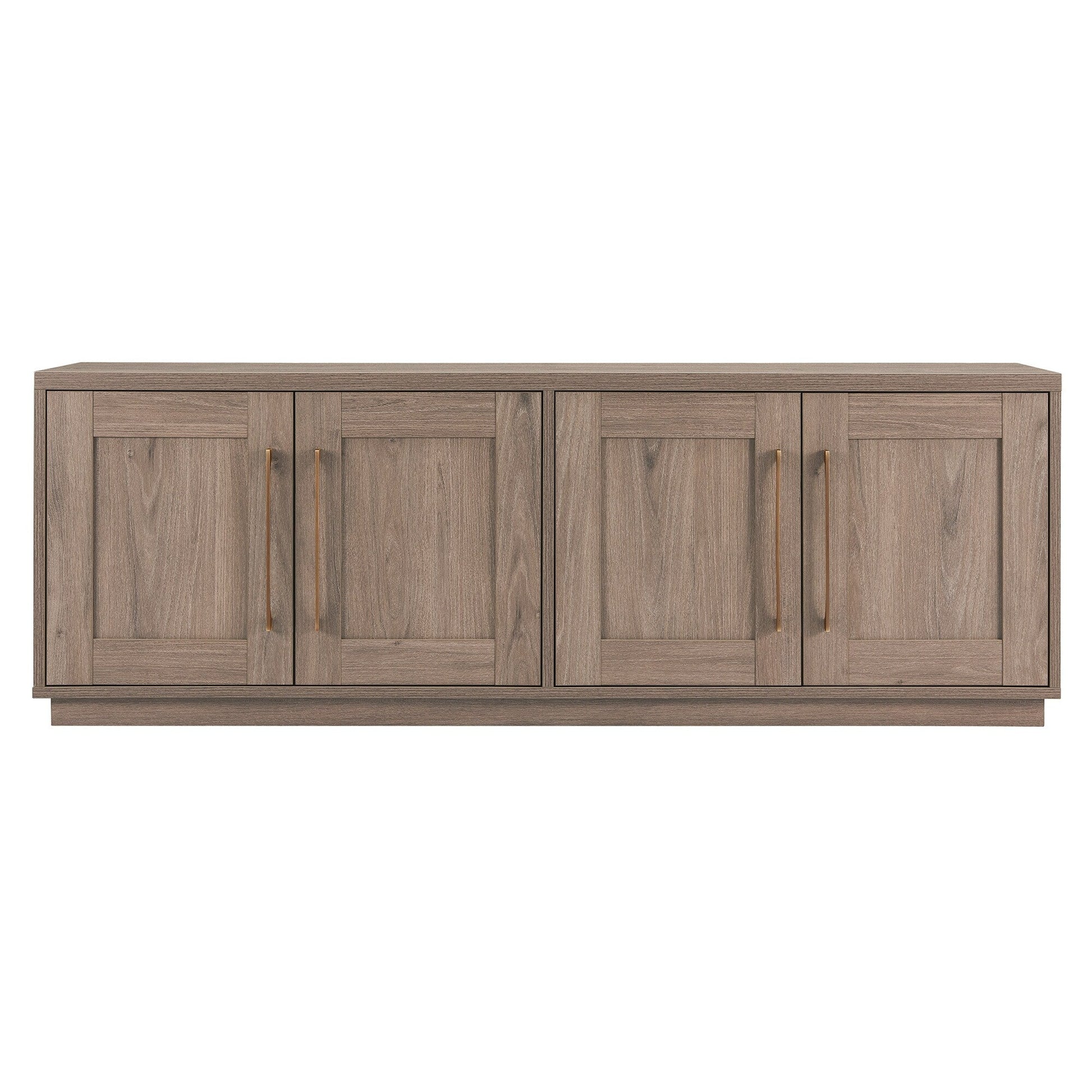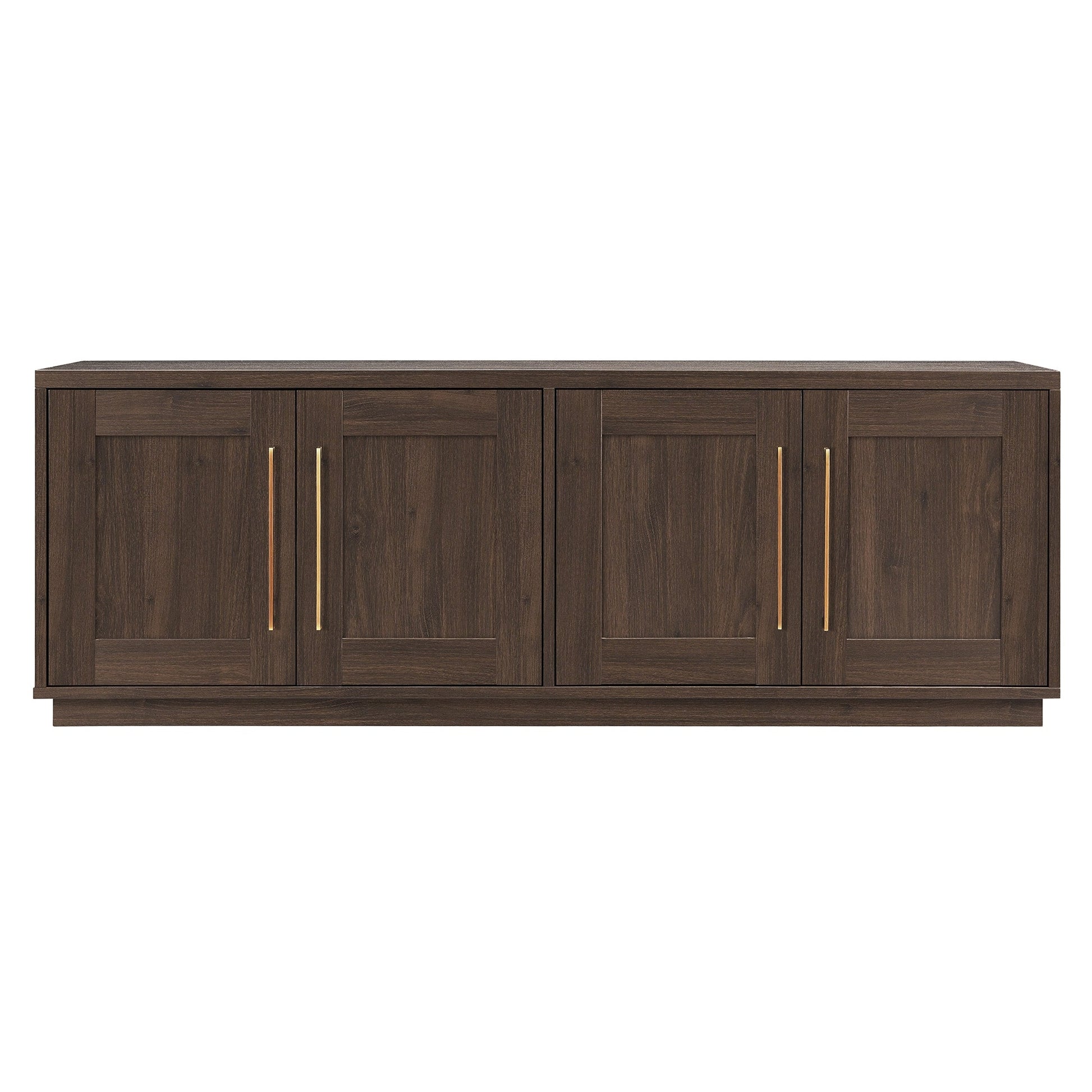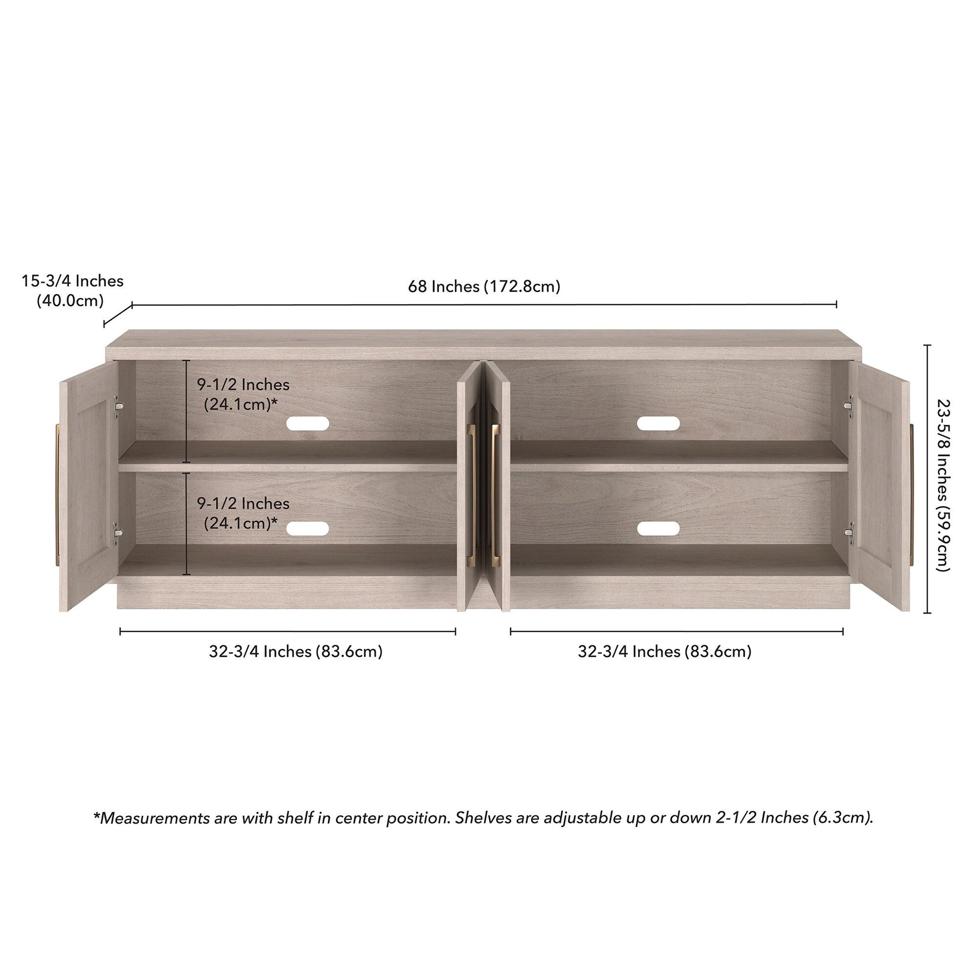 Combine functionality and classic transitional design with this modern TV stand. Its rich wood tone creates a warm neutral palette that will blend seamlessly into any color scheme, while its classic styling pairs perfectly with the existing design inspiration of your living room, den, or game room. This solid-backed stand features two large enclosed cabinets with sleek brass-finished hardware. Cable management cut-outs and adjustable inner shelves help keep your media storage and consoles organized.