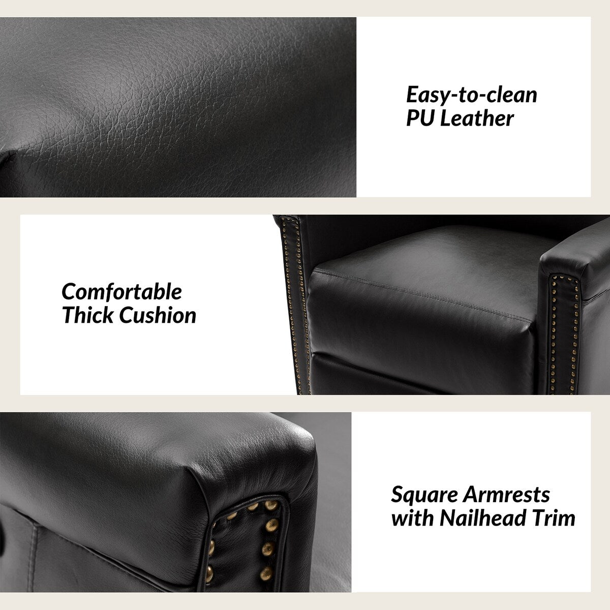 - Copper Nailhead Trim: Adorning the edges of the frame of the recliner set, the copper nailhead trim adds a touch of sophistication and refinement, accentuating the traditional charm of the recliner set and lending a luxurious aesthetic to the overall design.