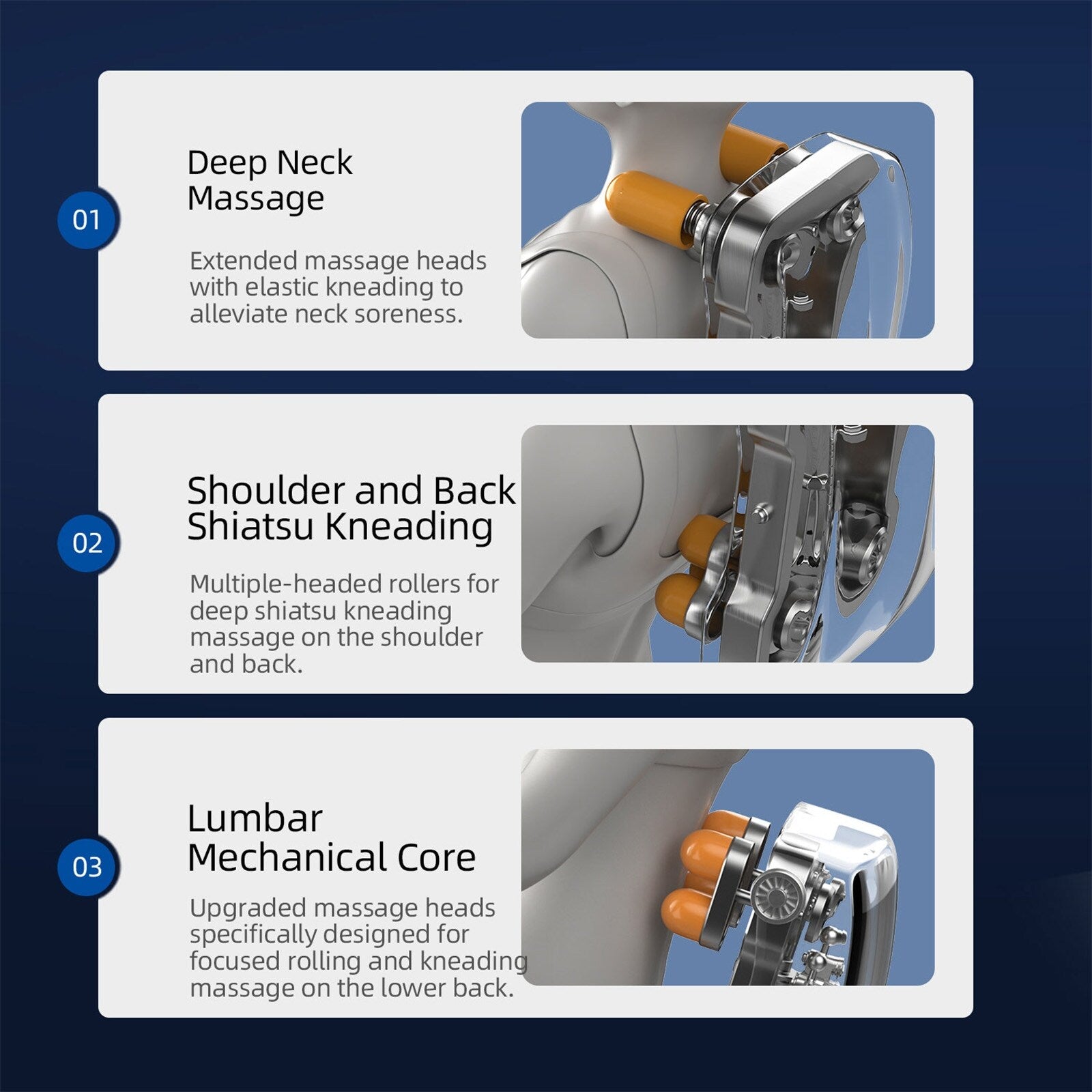 - 5 Massage Techniques: Enjoy professional-grade massage styles, including Kneading, Shiatsu, Clapping, Tapping, and Knocking, tailored to your relaxation needs.